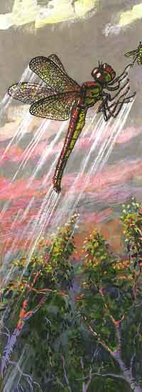 ...Но вдруг, открыв глаза, вижу над собою иной мир. Высокие деревья, вершины которых уж тронуты солнцем, яркое небо над ними, не такое, как во сне, а серебристое, светлое, вижу стрекозу на фоне этого неба, вылетевшую на первую утреннюю охоту. Рядом спит Сережа. Вдалеке знакомо гуднула электричка, окончательно возвращая меня к действительности и быстро гася странное волнение, что я испытал во сне.