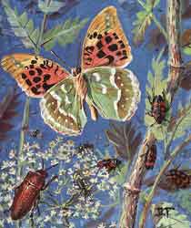 Читатель вправе спросить: откуда я мог тогда знать названия насекомых? А мне, как сейчас считаю, очень повезло. В дедовско-отцовской богатейшей библиотеке, кроме уже упомянутого Фабра («Энтомологические воспоминания») и Брема («Жизнь животных»), обильно и добротно иллюстрированных гравюрами, были по меньшей мере четыре многотомных энциклопедии, с шикарными цветными вкладками-таблицами, выполненными в давно забытой технике хромолитографии; авторы и художники этих изданий на изображения красивых объектов Природы тогда не скупились — и эти пособия оказались как нельзя кстати.