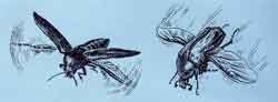 Сильные, подвижные, с цепкими ногами, бронзовки сверкали на солнце каким-то необыкновенным, ни на что другое не похожим блеском — то сияюще-зеленым, то с червонным отливом, то как свеженачищенная медь, то каким-то опалово-переливчатым. Летали они тоже по особенному, не как другие жуки: не поднимая надкрыльев, в их боковые особые вырезы выставят крылья и лихо взмывают вверх: полет доставлял им, наверное, истинное удовольствие — иначе зачем бы летящей бронзовке покачиваться в воздухе и выделывать вроде бы ненужные виражи?