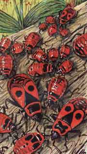 А тогда насекомые обитали не только в «диком» уголке Двора — жили они и рядом с домом. Весною и осенью около дома, на камнях, кирпичах появлялись симпатичные «солдатики». Верхняя часть тела у них была раскрашена узором, сильно напоминающим какую-то ритуальную африканскую маску — два больших черных глаза, черные нос и рот на ярко-красном плоском фоне. Держались солдатики компаниями, даже, наверное, семействами: несколько взрослых и великое множество детишек разного возраста, начиная от самых что ни на есть крошек; и облепленный ими камешек делался густо-красным. Милые эти создания не кусались, не издавали неприятного запаха, свойственного многим представителям отряда клопов, куда они относятся; они не боялись людей и домашних птиц, а те их не клевали, как я после узнал, по причине именно этой яркой красно-черной окраски — общепринятого в природе «сигнала» почему-либо несъедобных организмов. Что-то странное было в разновозрастных неторопливых скоплениях-собраниях солдатиков, и тогда я всерьез думал: они что-то там решают, о чем-то договариваются, к чему-то готовятся, и старался не мешать этому мирному красно-черному народцу.