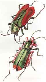 Громкое, как бы металлическое жужжание над этим заповедным цветущим уголком означало, что сюда пожаловал другой гость: жук из семейства златок. Златки — истинные дети солнца, летают только в сильную жару. В отличие от «широких литых» бронзовок у златок удлиненное, острое сзади тело; латы их тоже с металлическим блеском, но испещрены густыми ямками, бороздками, точками — своеобразная, тоже ни с чем другим не сравнимая, красота. Нижняя же сторона брюшка у них — блестящая и гладкая, горящая порой ярче бронзовочьих одежд. Зачем жуку такая «красота снизу»?