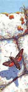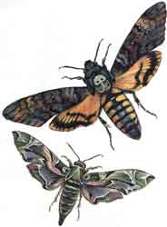 По неопытности мне тогда долго не удавалось сохранять в целости этих крупных красивых бабочек — в сачке за несколько секунд пыльца с крыльев и бархатистая шерстка со спинки сбивались. Гордостью моих первых наблюдений и зарисовок были крупные сфинксы (латинское название рода бражников) — зеленоватый, со сложным мраморным узором олеандровый бражник, серый с розовым вьюнковый бражник и, конечно же, знаменитая огромная «мертвая голова» со зловещим рисунком на спинке.