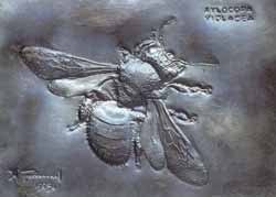 Несмотря на характерную внешность, цветные этюды с ксилокоп получались у меня не очень выразительными. Тогда — это было в 1971 году — я взял лист железа, добела очистил его шкуркой; выпуклое тело пчелы выковал на мягкой подставке молотком, мелкие же детали отчеканил зубильцем. Затем натер изделие половинкой луковицы — так меня учил отец воронить сталь — и провел несколько раз над пламенем газовой плиты до получения сине-фиолетового отлива. На этот раз ксилокопа получилась именно такой, какой она осталась в воспоминаниях моего детства; это изображение вы видите на цветном снимке.
