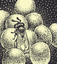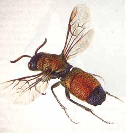 Я нагнулся и увидел, что шарики действительно глиняные и явно сработанные каким-то насекомым, что подтвердилось вскрытием одного из них. Это был домик маленькой осыэвмена, начиненный неподвижными, но живыми гусеничками; часть их была съедена находившейся тут же беловатой личинкой эвмена.