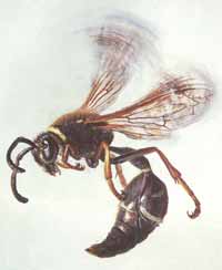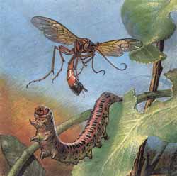 Еще одна любопытная деталь, тоже, наверное, чем-то помогающая охоте: летящий эвмен не жужжит вовсе. Как это у него получается — ума не приложу: крылья такие же, как у других складча-токрылых ос (в покое складываются вдоль пополам), а звука — никакого. Я подслу-шивал это у эвменьих гнезд специально - и прилетающая с грузом оса, и вылетающая на охоту или за глиной были безмолвны.