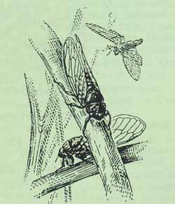 Личинки певчих цикад помногу лет живут глубоко под землей, посасывая острым хоботком корни растений; затем превращаются в нимф — кургузые странные создания с мощными «зубастыми» передними ногами, приспособленными для копания. Нимфа выбирается из подземелья наружу, замирает, шкурка ее лопается, и из нее выползает взрослая крылатая цикада. После в окрестностях Исилькуля я не раз находил на травинках эти странные опустевшие «скафандры» таинственных жителей подземелий, превратившихся в тонкоголосых неуловимых музыкантов.