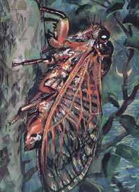 А на брюшке снизу были две пластины, под которыми виднелись щели. Это — звуковой аппарат цикад, совершенно не похожий ни на «смычки» кобылок, когда насекомое трет шершавой ногою о край крыла, ни на музыкальные аппараты кузнечиков и сверчков, у которых на одном крыле мелкозубчатая выпуклая жилка, а на другом — круглая рамка с туго натянутой пленкой — при трении жилки о край рамки получается громкий стрекот.