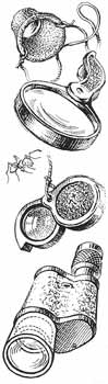 Бинокль нужен много для чего — призматический 8ми кратный. Но для объектов, находящихся ближе б метров, он не приспособлен. Однако если сделать на объективы съемные картонные насадки с плюсовыми очковыми стеклами — отлично видны и близкие предметы. Но оптические оси обеих половинок остаются параллельными — а надо бы их сводить — и у бинокля получается своего рода «косоглазие». В этом случае я применяю лишь одну насадку и использую прибор как монокуляр. С его помощью удобно наблюдать издали за работой роющих ос, жуковнавозников, кузнечиков, наездников и многих других насекомых.