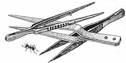 Пинцет нужен для многих целей — брать жалящих насекомых, доставать из норок личинок... Лучше всего длинный, 20сантиметровый, но с мягкой пружинистостью, чего можно достичь, выбрав точилом часть металла в указанном на схеме месте. Любитель слесарнопаяльных дел сможет сделать неплохие пинцеты вроде тех, что на рисунке, комбинируя жесть с проволокой, частями бритвенных лезвий, старой часовой пружины. Пинцет, что справа, — очень острый, прочный, и в то же время мягкопружинистый, служит не только для лабораторных микроработ — нередко выручает и в поле. Сделал я его, сильно обточив 12сантиметровый обычный пинцет, включая пружинящие его пластины.