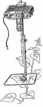 Отличный инструмент для макросъемок насекомых придумал профессор П. И. Мариковский — я успешно пользуюсь им много лет. В старый «Фотокор» вместо кассеты вставлена пластина, в центре ее — муфта с резьбой, куда ввертывается «Зенит» без объектива. Растяжением меха достигаем любого увеличения, а со сжатым мехом «фотокор» работает как телеобъектив к «Зениту». При сильных увеличениях без привычки трудновато поймать в визир нужный живой объект, одновременно добиваясь резкости наклонами туловища, поэтому, чтобы «набить руку», потренируйтесь на каких-нибудь домашних предметах. При сильных увеличениях экспозиции более 1/125 секунды нежелательны: от движения трав ветром, собственных движений насекомого, дрожания рук может получиться «смазь».