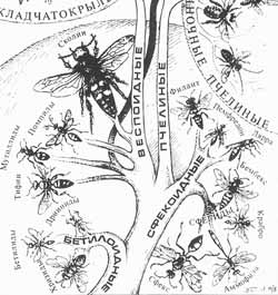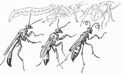 Перед вами — схематические рисунки трех ос, вернее, «обобществленные портреты» одиноких ос трех групп (в каждой из групп — множество видов): слева песчаная оса аммофила, в центре — сфекс, справа — дорожная оса помпил. Аммофилы заготавливают для своих детей гусениц, отлавливая их и парализуя; сфексы — кобылок (а те, что покрупнее, — кузнечиков и сверчков), помпилы охотятся на пауков — тоже разных размеров, в зависимости от своего роста.