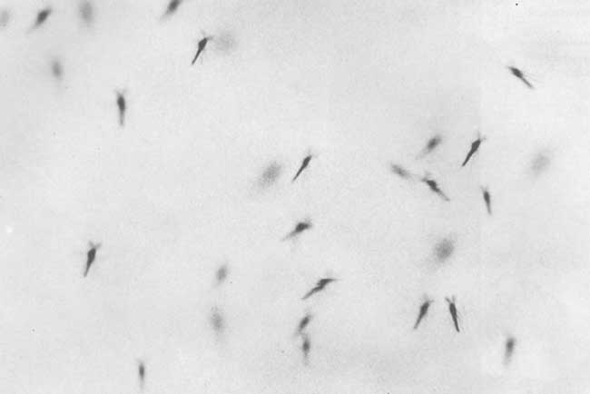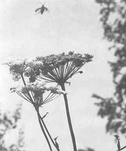 Летящих насекомых снимать почти невозможно, разве что «стрелять» наугад в глубину облака роя поденок или звонцов. Иногда повезет и с жуками: «щелкаешь» его на цветке, он в этот миг, испугавшись, взлетел — и получается редкий кадр. Неплохо могут получиться насекомые в «стоячем» полете — мухижурчалки, жужжала. Но фотоохота на них требует много терпения, выдумки. И — пленки... Я считаю удачным, если на одну пленку приходится одиндва хороших снимка.