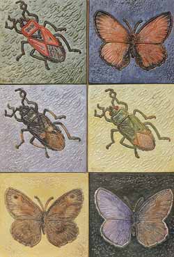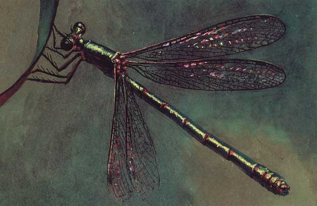 Иногда я поступаю так: снимаю живое насекомое на слайд, с которого пишу «натурщика» красками, непременно убирая все лишнее и усиливая главное. По этому принципу сделан этюд стрекозылютки.
