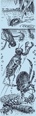 Жители озер Камышловской долины: жучок вертячка, клопик гребляк, личинка стрекозы (нападает на комариных личинок), плавунец, личинка веснянки, личинки ручейников (в домиках)