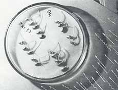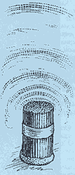 ...А ведь мне удалось-таки сделать приборчики для объективной регистрации ЭПС, отлично реагирующие на близость насекомьих гнезд. Вот они на рисунке: герметические сосуды, в которых на паутинках наклонно подвешены соломинки и обожженные ветки — рисовальные угольки; на дне немного воды, чтобы исключить электростатику, мешающую опытам при сухом воздухе. Наводишь на верхний конец индикатора старое осиное гнездо, пчелиные соты, пучок колосьев — индикатор медленно отходит на десятки градусов... Чуда здесь нет: энергия мерцающих электронов обоих многополостных тел создает в пространстве систему суммарных волн, волна же — это энергия, способная произвести работу по взаиморасталкиванию этих предметов даже сквозь преграды, подобные толстостенной стальной капсуле (на фотографии). Трудно представить, что сквозь ее броню запросто проникают волны крохотного легкого осиного гнездышка, которое видно на снимке, и индикатор внутри этой тяжеленной глухой капсулы убегает от давно нежилого осиного гнезда порой на полоборота — но это так. Сомневающихся прошу посетить Музей агроэкологии под Новосибирском, где вы увидите все это своими глазами.