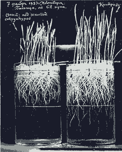 Эксперименты по воздействию ЭПС на прорастающие пшеничные зерна. Расстояние между опытной (под «решетками») чашкой и контрольной - 90 сантиметров В первом сосуде зерна почти погибли.