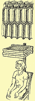 Там же, в Музее, стоит всегда действующий сотовый обезболиватель; каждый, севший на этот стул под футляр, в котором находятся несколько рамок с пустыми, но полномерными сотами медоносной пчелы (по пчеловодному «сушь»), почти наверняка почувствует нечто через несколько минут (что именно, напишите мне, буду благодарен), а вот у кого болит голова — через считанные минуты простится с болью, во всяком случае, на несколько часов. Мои обезболиватели успешно применяются в разных уголках страны — секрета из своей находки я не делал. Излучение четко уловимо рукой, если ее ладонью вверх подносить снизу к футляру с сотами, который может быть картонным, фанерным, а еще лучше — из жести, с наглухо запаянными швами.
