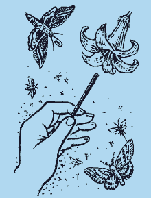 И еще одну тайну открыли мне в те годы друзья насекомые, связанные с цветками растений. Оказалось, что кроме цвета, запаха, нектара цветки, дабы привлечь своих крылатых опылителей, имеют подобный же волновой маяк, весьма мощный и тоже ничем не перекрываемый. Обнаружил я его рисовальным угольком — обожженной веточкой, водя ею напротив крупных колоколообразных цветков — тюльпанов, лилий, амариллисов, мальвы, тыквы: еще издали чувствовалось как бы торможение этого «детектора». Вскоре я находил цветок в темной комнате почти безошибочно с расстояния в одиндва метра — но при условии, что его не смещали, так как на старом месте какое-то время оставалась «ложная цель» — уже знакомый нам «остаточный фантом». Я никакой не экстрасенс, и это получается буквально у каждого после некоторой тренировки; вместо уголька можно использовать дециметровый обломок стебля желтого сортового веника или короткий карандашик, тупая сторона которого должна смотреть на цветок. У иных же просто ладонь, или язык, или даже все лицо ощутят идущее от цветка «тепло», «холод», «мурашки». Как показали многочисленные опыты, более чувствительны к »цветковым» Волнам Материи дети и подростки.