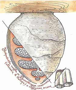 Схематический разрез гнезда галиктов близ самой глубокой его части. Внизу — обломки гнезд, положенные дырочками вверх, дают особенно сильное излучение.