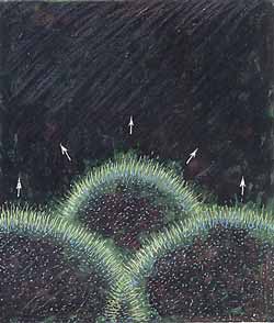 Но нет: вдруг мой кокончик срывается с места и стремительно летит от не шелохнувшейся ватки, «как и положено» — вверх и вбок. Замеряю прыжок в длину — сорок два миллиметра, то есть норма. Насекомое, наверное, совершало свой бросок или удар не по нижней, а по верхней части кокона, во всяком случае делало там нечто такое, что приводило капсулу в движение.