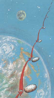 Ну а теперь пофантазируем немного: захотелось бы, скажем, батиплектесу улететь с Земли вообще. У взрослого, крылатого, это б не получилось из-за «потолка»: атмосфера наша сверху редкая, не для крылатых; иное дело личинка в коконе. Подняла она свою капсулу в прыжке на свои пять сантиметров, в верхней же точке поддала ее еще таким же образом, и еще, и еще, и если бы кокон был надежно герметичным — имею в виду запас воздуха для дыхания пилота — то что помешало бы выходу аппарата за пределы атмосферы и дальнейшему беспредельному наращиванию скорости? А ничто!