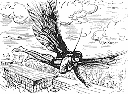 ...В конце моей первой книги «Миллион загадок», вышедшей в Новосибирске в 1968 году, есть рисунок, который я воспроизвожу снова: человек летит над Академгородком с помощью аппарата, основу которого составляют большущие насекомьи крылья. Я тогда мечталфантазировал: вот такой бы аппарат изобрести! Мечта, как ни странно, сбывается, и именно через дружбу с насекомыми, но не слепым копированием наиболее заметных узлов и деталей — тех же крыльев, вызывающих теперь у меня улыбку, — а глубоким изучением живой Природы. Но без шестиногих крылатых друзей у меня ничего не получилось бы — и наверняка не получится у других.
