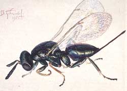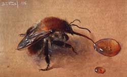 Осы вида Паравёспула германика, поселившиеся на Поляне в двух шмелиных ульях, повадились воровать у наших шмелишек мед, наглея с каждым днем. Я не раз заставал их залетающими в ульи и вылетающими из них с отяжелевшим брюшком. Затем через стенку застекленного наблюдательного улья зафиксировал все подробности этого бессовестного грабежа. Нахально расталкивая шмелей, воровка уверенно направилась к медовым горшочкам — старым пустым коконам, обмазанным воском и наполненным до краев густой блестящей жидкостью. Ополовинила один горшочек — и к выходу, а следом за ней еще две осы. Через час медовых запасов у шмелиной семьи как не бывало.
