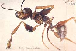 ...Если при закладке шмелиного улья над ватой остается большая воздушная полость — его могут заселить общественные осы. Поясню: общественные насекомые — это те, что, как шмели, живут семьями; к одиночным же осам, строящим «персональные» гнезда и никогда не видящим детей, относятся описанные в «Дорогах» сфексы и эвмены (а также множество других групп хищных ос). Осаосновательница семьи, найдя подходящую просторную полость, вылепляет поначалу крохотный — ячеек на семь — сот, который одевает общей оболочкой. Стройматериалом служит серая, довольно прочная бумага: оса скоблит где-нибудь старую древесину, смешивает ее с клейкой слюной, доставляет в гнездо и формирует из нее деталь тонкой крепкой стенки (первыми изобретателями бумаги были не люди, а осы).