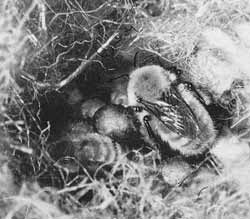 Замечательная картина! Маленькие мохнатые шмелята — их восемь — и большущая мама эффектно облепили сот с будущим потомством. Шмели этого вида окрашены очень своеобразно: по светложелтому фону черные широкие перевязки, а конец брюшка — яркокрасный. Весь наличный состав семьи плотно припал к коконам с куколками, к личиночьим и яйцевым «нашлепкам».
