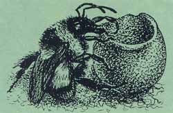 Барахтался шмель, барахтался, пытаясь избавиться от нахала, взобрался с ним на травинку, зажужжал изо всех сил, кое-как поднялся, и неровно, тяжело полетел к своему жилищу: сейчас не до цветков, надо избавиться от неожиданного «груза»; я — бегом за ним. Шмель — к подземному летку, я быстренько снимаю дерновую кровлю, крышку ящика, приподнимаю вату, жду... Вот показалась «парочка» — ковыляющий шмель с жуком, поджавшим ноги и висящим на шмелиной челюсти.