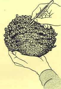 Осторожно снимаю дерновину, лоскут полиэтиленовой пленки, деревянную крышку улья. Вся заполнявшая его вата тщательно обработана: пышно и равномерно натереблена, стала чуть-чуть более желтой; сверху ей придана форма правильного холмика. Аккуратно отгибаю верхнюю часть этой кровли и чувствую: внутри теплотепло, даже жарко. Это заботливая шмелиха, «пережигая» внутри себя запасенный за день мед, согревает потомство, поддерживая в гнездовой камере температуру, близкую к температуре человеческого тела, даже в самую холодную погоду.