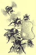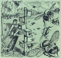 Шмели разных видов жили у меня тогда и на балконе, и прямо в квартире, где порой гудело до сорока громадных шмелиных самок, а на двери красовалась надпись: «Осторожно — шмели!». Здесь я проник во многие тайны совсем необычной, странной шмелиной жизни, изучил их повадки, привычки, характеры; многие гнездились прямо тут, в комнате. Но для массового разведения шмелей эти способы не годились, и я стал делать «имитации» мышиных природных гнезд: сначала это были ямки, наполненные ватой, паклей и прикрытые сверху палочками и дерном; после этого я перешел на ящики со «шмелепроводом», с устройством которых мы уже познакомились. Но на луговинах и полянах их летки затаптывал пасущийся скот, иные же я просто терял, когда разрастались травы. Ставил вешки, но они привлекали внимание любопытных, которые выворачивали из земли мои конструкции и выпотрашивали их содержимое — нет ли тут меда?