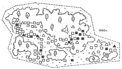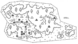 Квадратики — шмелёвники подземные, треугольники — надземные. Зачернены те, в которых «сами собой» образовались мощные шмелиные семьи.